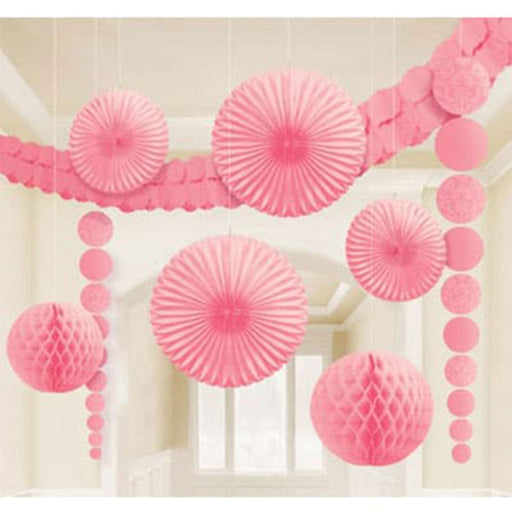 This Lovely Assortment Of Light Pink Party Decorations Features A Garland, Honeycomb Balls, Tissue Fans And Damask Print Accented Hanging Decoratio...
