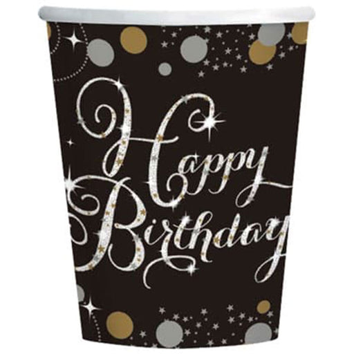 Gold Celebration Happy Birthday Paper Cups Holds 266ml. These Gold, Black And Silver Paper Cups Are Perfect For Your Birthday Party. 266ml 8 Cups...