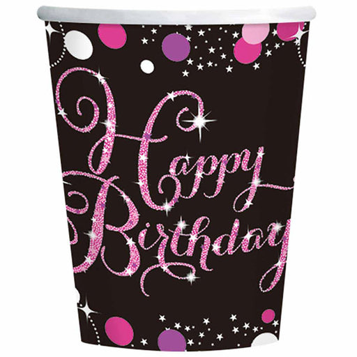 Pink Celebration Happy Birthday Paper Cups Holds 266ml. These Pink And Black Paper Cups Are Perfect For Your Birthday Party. 266ml 8 Cups Per Pack