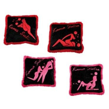 kamasutra adult novelty plush cushions. Each cushion is 30cm x 30cm. Available in pink and black and red and black.
