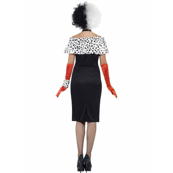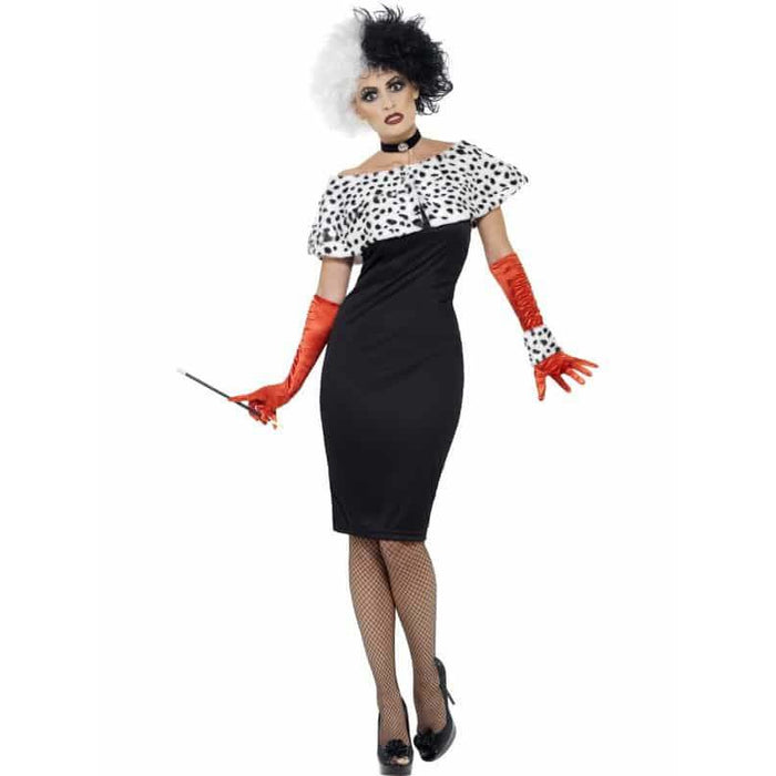 Evil Madame 101 Dalmatians Cruella De Vil Fairy Tale Fancy Dress Costumes Includes Dress With Gloves, Shrug and Choker.