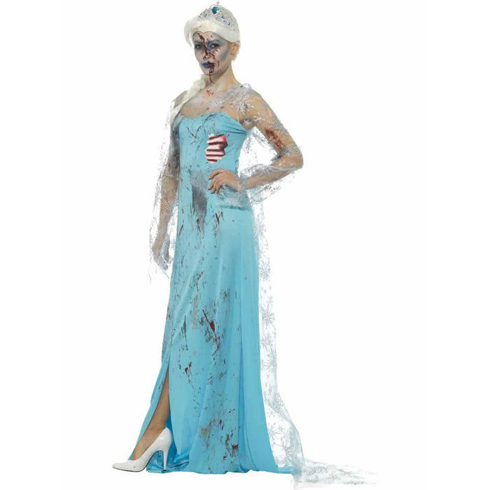 Freeze Time This Halloween In Our Zombie Froze To Death Princess Fancy Dress Costume Featuring Long Blue Snowflake Detail Dress With Attached Latex Ribs And Tiara.