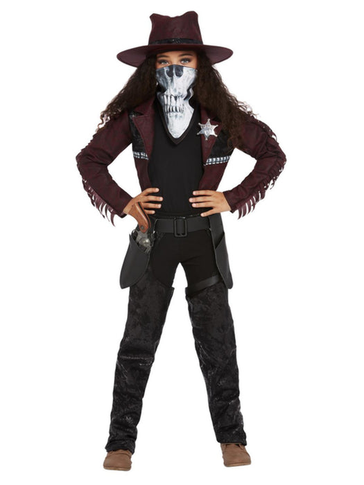 Deluxe Dark Spirit Western Cowgirl Costume, Burgundy, with Jacket, Chaps, Holster, Hat, and Mask.