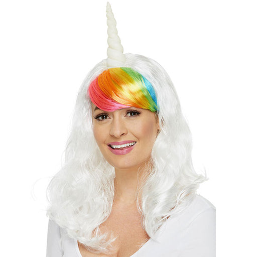 Look Magical In This Ladies Unicorn Wig With Horn And Rainbow Fringe.