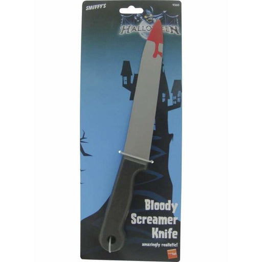 Finish your Halloween costume off with this black, grey and red blood stained screamer knife, plastic, large, 33cm, on tie card.