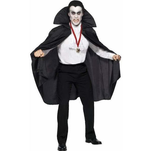 Long Black Vampire Halloween Fabric Cape With Stand Up Collar. The Black Fabric Capes Measure 114cm Long.