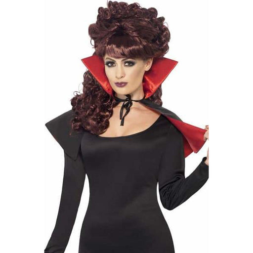 Ladies Red And Black Mini Vampire Halloween Cape With High Collar.