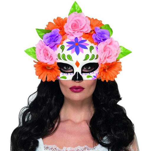 Day Of The Dead Multi Coloured Eye mask With Assorted Flowers And Leaf Detail.