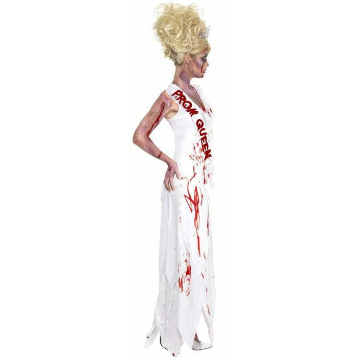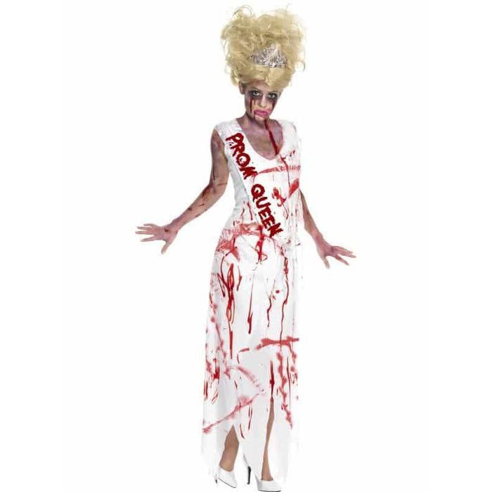 Claim your crown as the best dressed this Halloween with our high school horror zombie Prom Queen fancy dress costume. This high school horror Prom Queen zombie Halloween costume includes white dress with blood splat effect and attached blood written prom queen sash.
