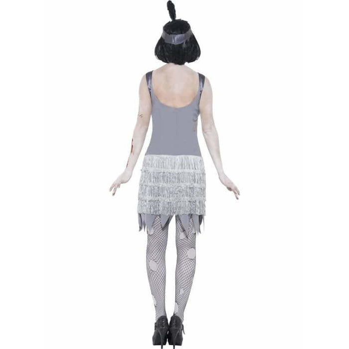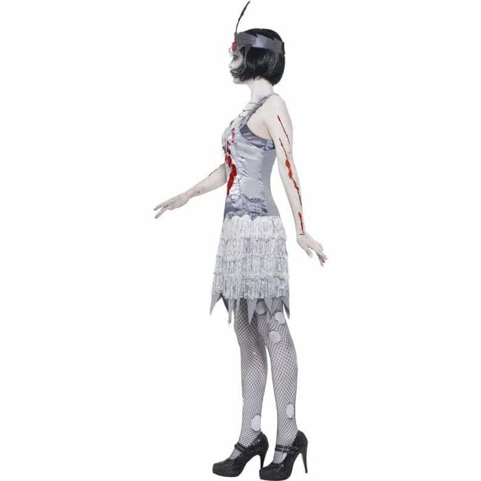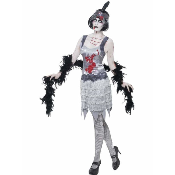 Not So Much Of 1920's Dazzle In These Zombie Flapper Halloween Fancy Dress Costumes. This Zombie Flapper Costume Includes Grey Bloody Dress And Headband.