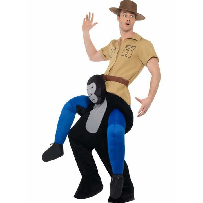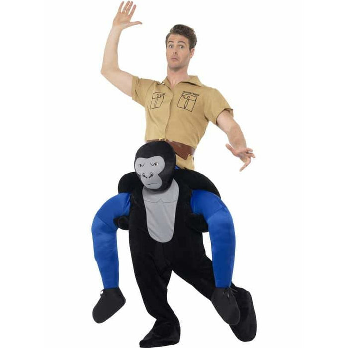 Take A Walk On The Wild Side With Our Piggyback Gorilla Fancy Dress Costume Featuring One Piece Suit With Mock Legs.