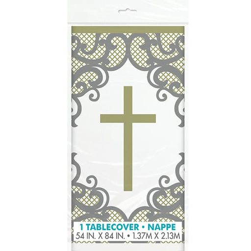 Fancy gold cross plastic table cover with silver filigree design are perfect for religious party celebrations. 54 inches x 84 inches 1 tablecover...