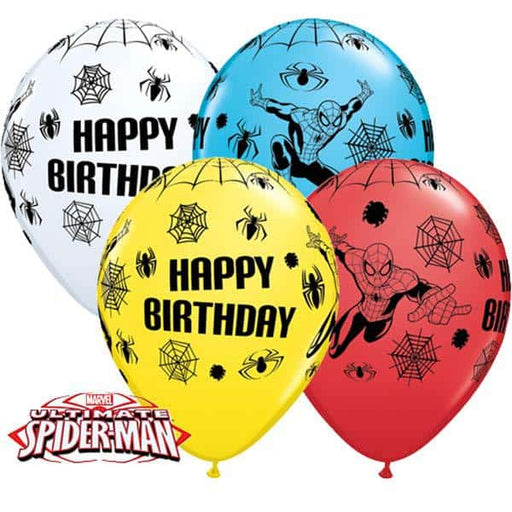 Uninflated Marvels Spiderman Happy Birthday 11 inch Assorted Latex Balloons. This Assortment Includes White, Red, Yellow And Robins Egg Blue Wit...