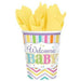 Enjoy your baby shower with these welcome baby bright party paper cups with brightly coloured stripes and chevron detail.