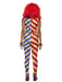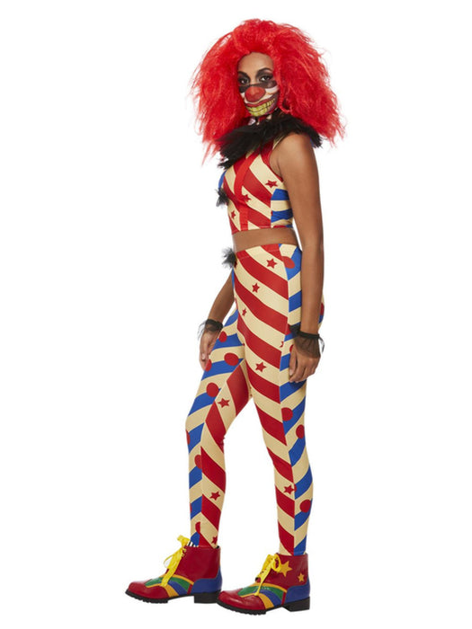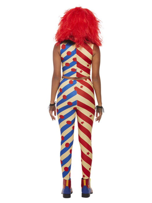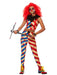 Creepy Clown Womens Halloween Costume With Red & Blue, Top, Trousers, Mask & Frills.